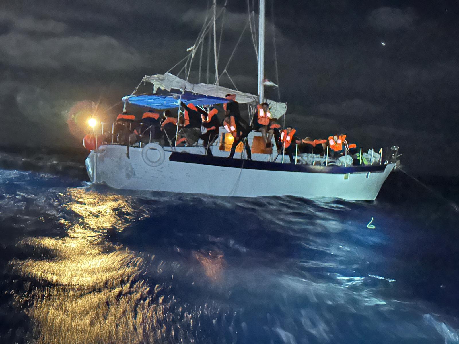 In dieser Nacht, als unsere schnellen Rettungsboote im Wasser sind, kann ich es trotz Dunkelheit in der Ferne sehen. Es ist ein 12 Meter langes Segelboot, das mit 75 Personen an Bord völlig überfüllt ist und wegen der Wellen und dem Wind stark schaukelt.