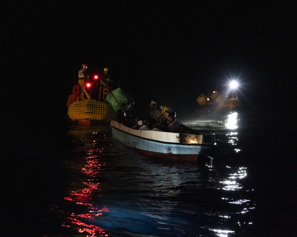 Die Vorbereitungen sind dieselben, das Team funktioniert wie eine gut geölte Maschine. Alle wissen, was zu tun ist. An Deck warten und nicht zu wissen, wie es den Menschen geht, ist trotzdem nicht leicht. Wieder evakuiert das SAR-Team die Menschen in Seenot auf die RHIBS, dieses Mal im Dunkeln.