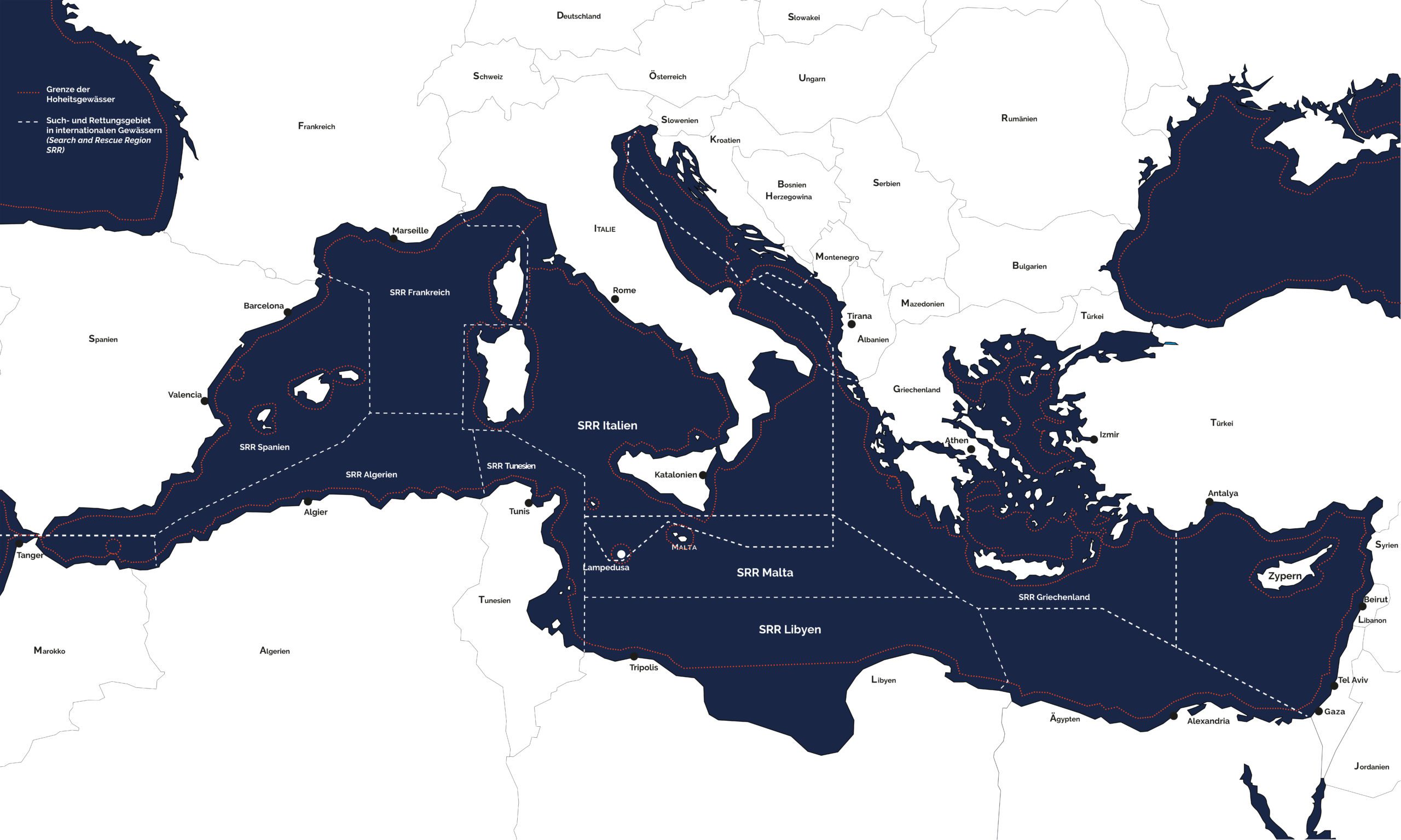 Malta hingegen stellte 2018 die Koordinierung von Rettungen mit zivilen SAR-Organisationen ein. Dies drückt sich dadurch aus, dass die SAR-Schiffe nicht über Boote in Seenot informiert werden und in Malta keine sicheren Häfen zugewiesen bekommen.